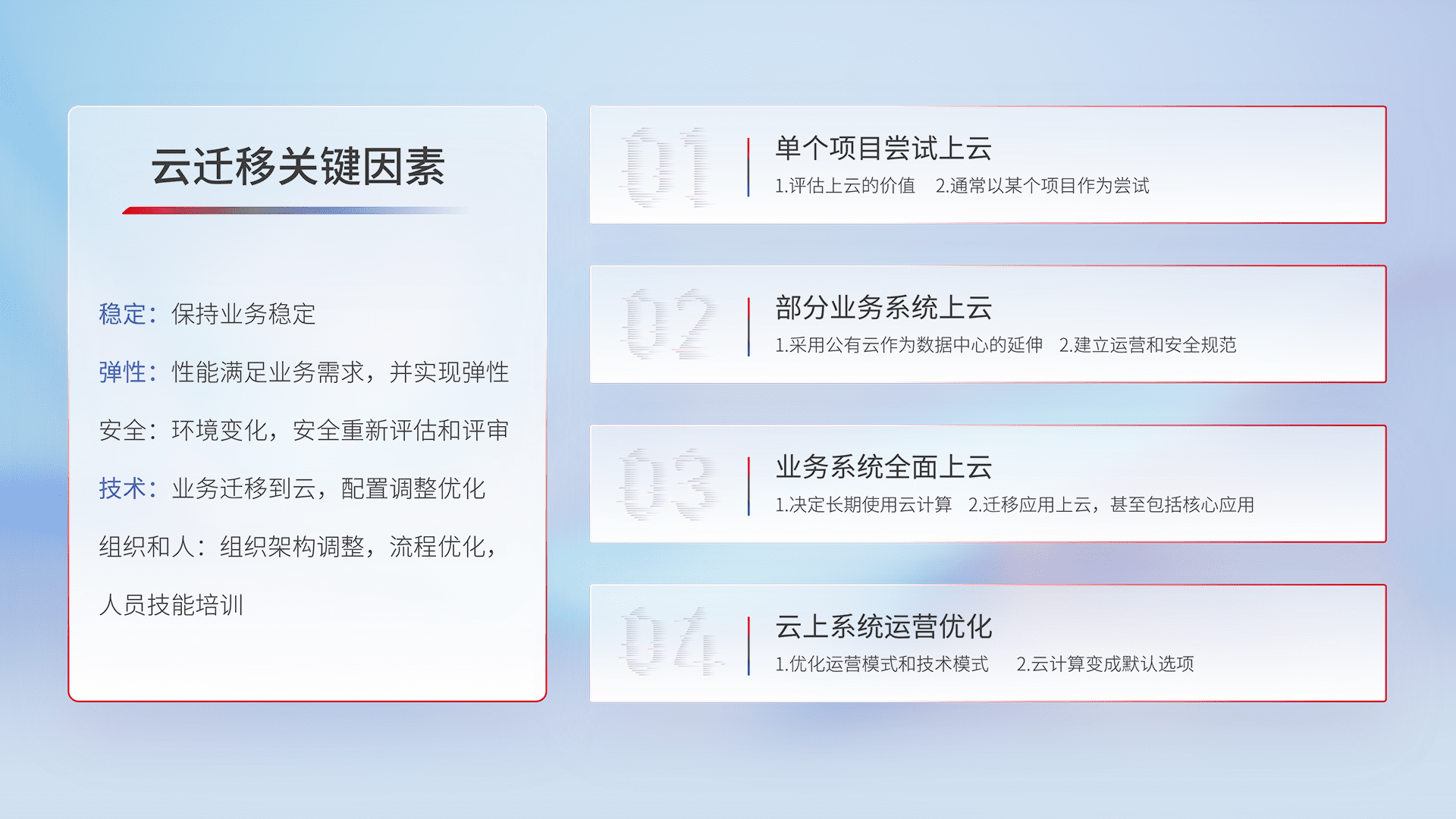 结合实际业务,,从规划设计、、、云平台选型、、、、云原生改造、、、、数据迁移、、、集成交付,,迁移全过程为客户识别最佳上云路径,,,做好风险识别管理,,,设计网络架构、、身份权限、、安全审计合规、、操作审计、、、、日志审计、、监控告警策略、、、多站点容灾设计等,,,对云上基础设施进行整体规划,,,,提升IT治理水平,,,以满足弹性、、高可用、、、、高性能的需求。。。。