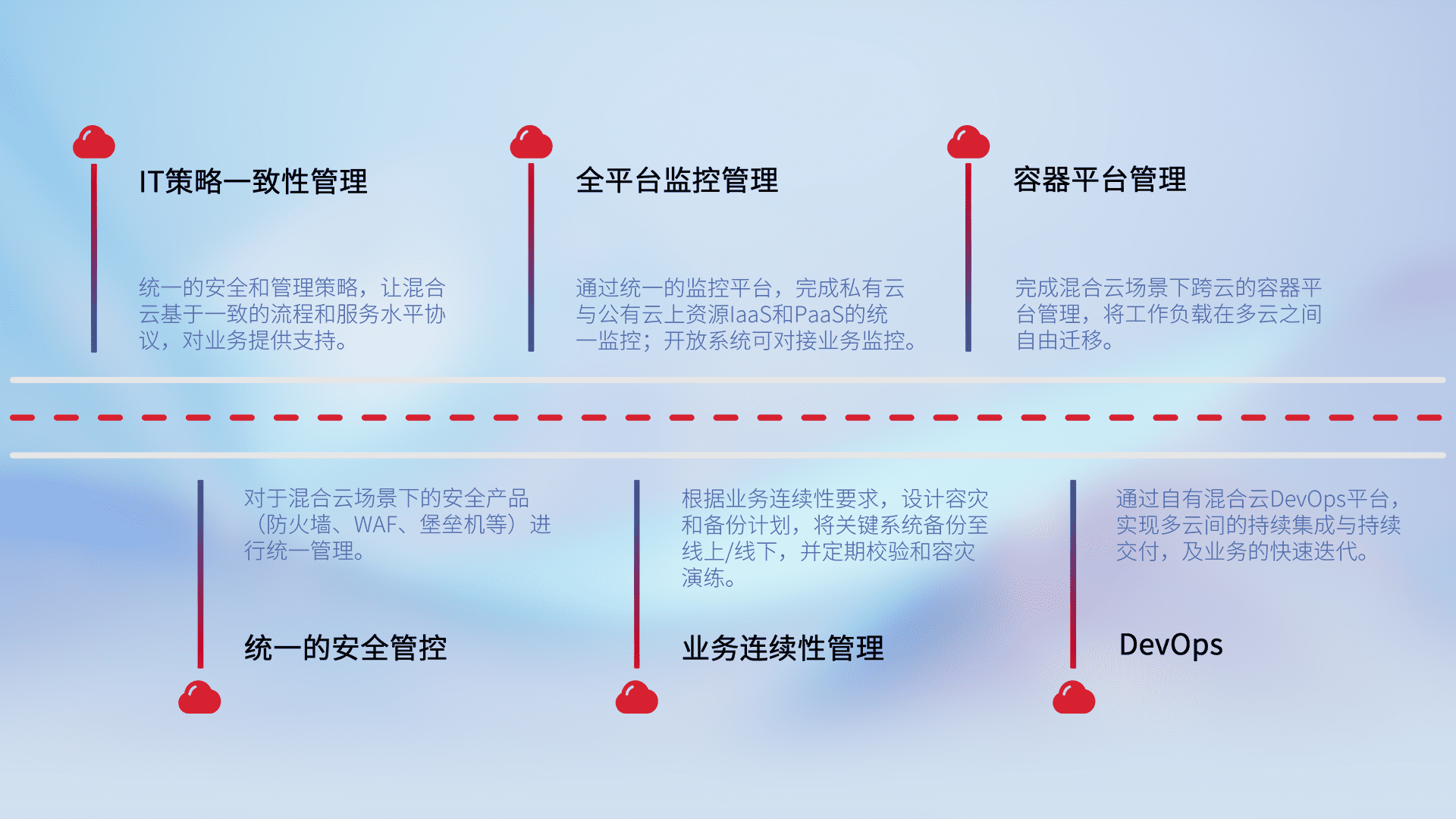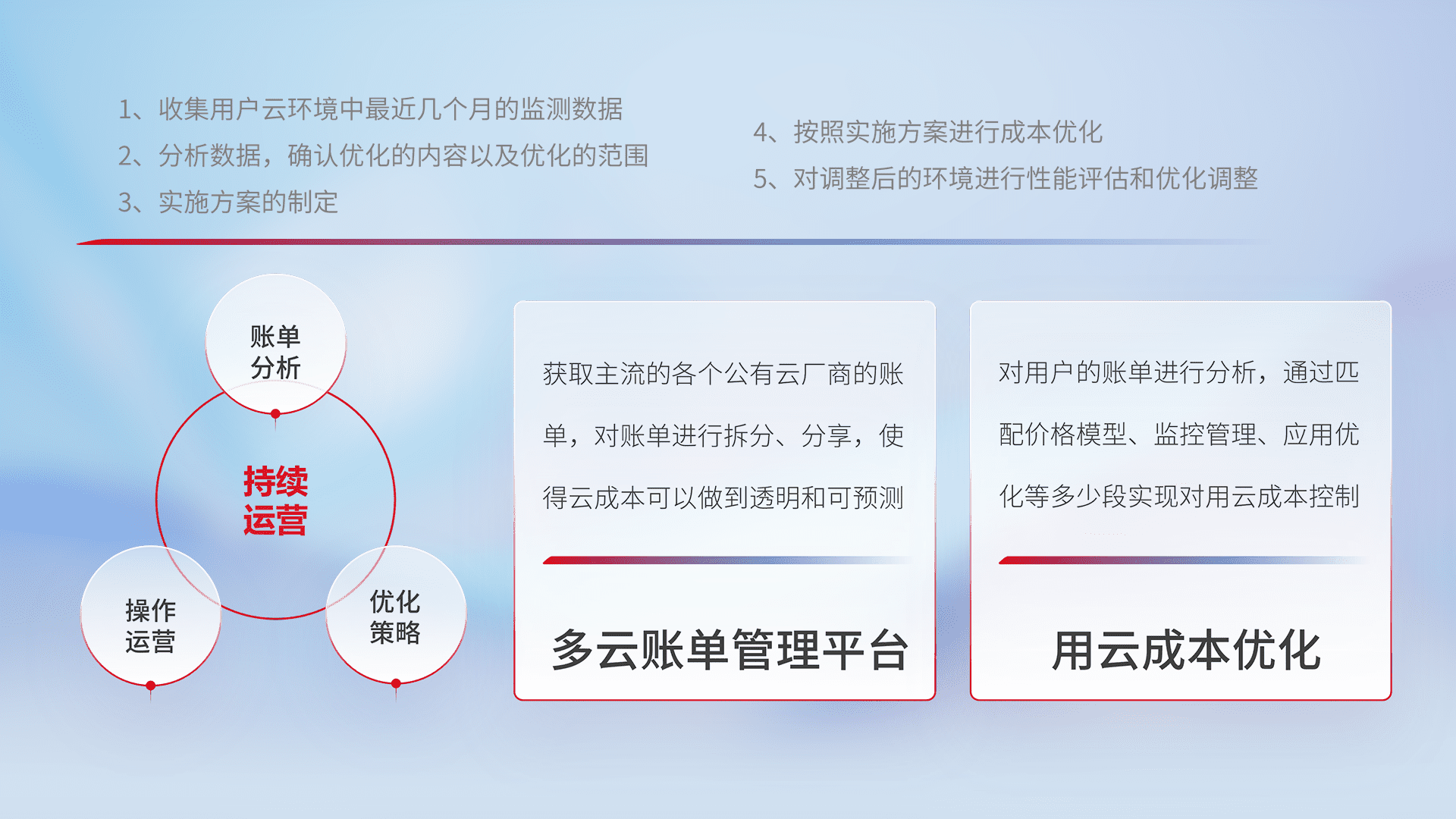 通过多云纳管,,以统一的资源数据模型把客户的云资源进行抽象和封装,,,,进而实现对多云资源的统一操作,,,,保障云资源管理的可靠性、、、稳定性与可用性。。。量身定制化运维内容,,配置、、、、开发运维、、补丁管理、、、、备份、、、监控、、、认证和访问管理、、审计和日常巡检等,,,保障在用云过程中的可靠度,,,稳定度以及高可用率。。