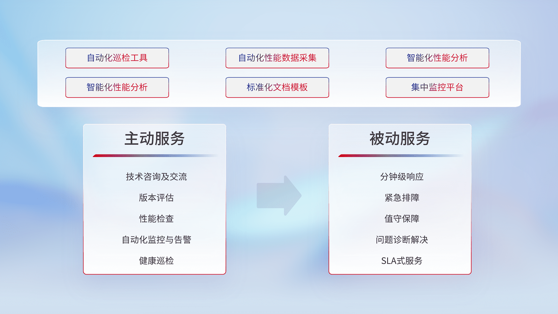 智能化工具和标准化文档,,,保障服务质量,,,,提供主动服务(包含技术咨询、、、、版本评估、、、性能检查、、、自动化监控与告警、、、健康巡检)和被动服务包含(分钟级响应、、紧急排障、、、值守保障、、、问题诊断解决、、、SLA服务)。。